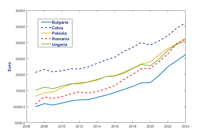 Pentru Europa Centrală și de Est, evoluțiile evidențiate în Figura 4 subliniază faptul că România a avut una dintre cele mai accelerate și mai susținute dinamici ale PIB pe locuitor din regiune. La momentul aderării la Uniunea Europeană, în ceea ce privește acest indicator, țara noastră se plasa la un nivel superior doar Bulgariei. Totodată, PIB-ul pe locuitor al Ungariei era superior celui al României și al Poloniei. Circa 18 ani mai târziu, în 2024, PIB-ul pe locuitor al României era foarte apropiat de cel al Poloniei și superior celui aferent Ungariei.
