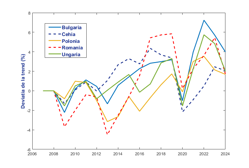 Pentru o imagine mai detaliată asupra procesului de convergență, în Figura 5 de mai jos, am raportat evoluțiile ciclice ale indicatorului PIB pe locuitor pentru întreaga regiune. Și de această dată, am utilizat varianta one-sided a filtrului Hodrick-Prescott, unde parametrul de netezire lambda a fost calibrat la valoarea 100, dată fiind frecvența anuală a datelor. Din evoluțiile prezentate, se observă faptul că seria ciclică obținută pentru țara noastră înregistrează variații mai ample, cu o magnitudine clar mai pronunțată în faza de expansiune.
