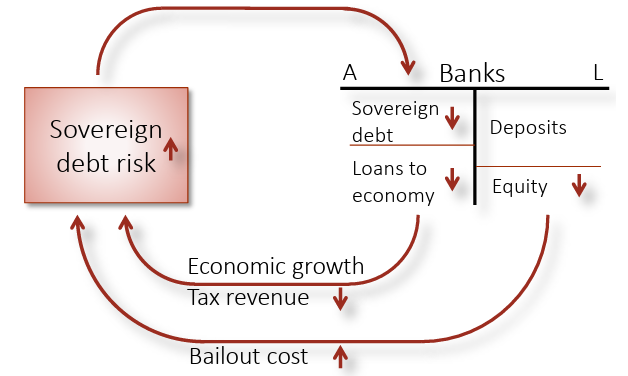 În figura de mai sus, regăsim exemplul a două așa-numite diabolic loops, în limbajul lui Brunnermeier et al. (2011), utilizate pentru a descrie interacțiunea dintre situația fiscal-bugetară și stabilitatea financiară prin canalului sectorului bancar în perioada 2009-2012, când a avut loc o criză a datoriilor fiscale în cazul unor țări din zona euro. Astfel, conform lui Brunnermeier et al. (2011), în țări ale zonei euro, precum Grecia, Irlanda, Italia, Portugalia și Spania, deteriorarea credibilității financiare a statului a condus la o depreciere semnificativă a valorii titlurilor de stat deținute de instituțiile de credit. Aspectele menționate au condus mai departe la limitarea capacității instituțiilor de credit de a finanța economia reală. Aceasta a determinat efecte de contracție, reducând încasările fiscale și deteriorând suplimentar situația finanțelor publice, ceea ce a declanșat un nou mecanism de retroacțiune negativă în economia reală.