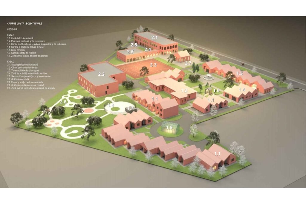 Campus Lumya este răspunsul concret la această nevoie: primul spațiu multifuncțional din țară dedicat adolescenților și adulților cu autism. Acesta este construit în două etape majore. Prima etapă (2024–2025), aflată în desfășurare, include un centru medical ambulator, un centru de terapii și viață independentă cu 9 săli tematice, o zonă de locuire asistată pentru până la 50 de beneficiari, cantină și spații de recreere. A doua etapă (2026–2027) va adăuga o școală profesională adaptată, o bază sportivă și de recreere și spații comunitare.