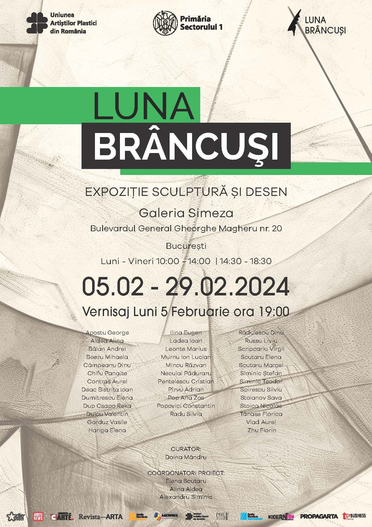 Filiala de Sculptură București a Uniunii Artiștilor Plastici din România organizează, în perioada 01-29 februarie 2024, la Galeria Academia si Galeria Simeza evenimentul dedicat sculpturii contemporane: Luna Brâncuși.