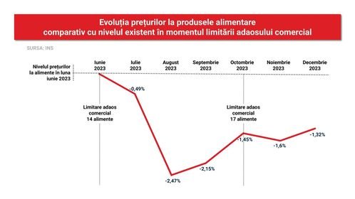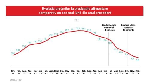 „Conform datelor INS, prețurile din luna decembrie 2023 au fost cu #5.8% mai mari față de cele din decembrie 2022, în timp ce în luna iunie 2023 (înainte de introducerea acestei măsuri) diferența față de aceeași lună din anul precedent era de aproape #18%”, a continuat Marcel Ciolacu.