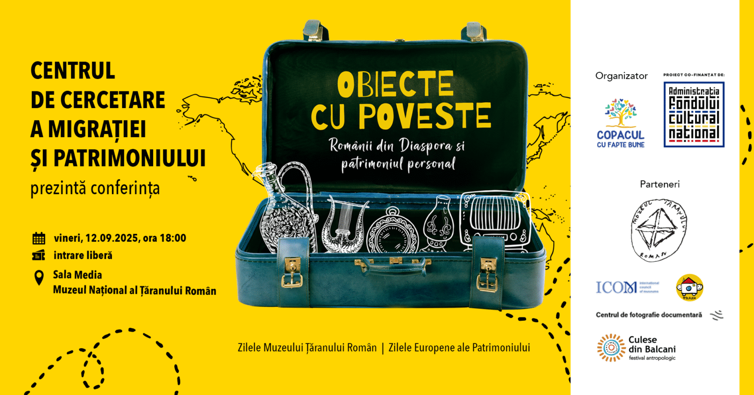 Centrul de Cercetare a Migrației și Patrimoniului anunță prima sa conferință-dezbatere, adresată atât specialiștilor cât și publicului larg, cu tema „Obiecte cu poveste. Românii din Diaspora și patrimoniul personal”. Evenimentul va avea loc vineri, 12 septembrie 2025, începând cu ora 18:00, la Sala Media a Muzeului Național al Țăranului Român, potrivit unui comunicat de presă.
