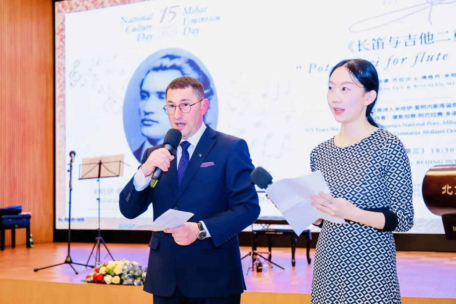 Poezie, muzică, artă, pasiune, emoții și prietenie, la evenimentul dedicat Zilei Culturii Române și geniului creator Mihai Eminescu la 175 de ani de la nașterea sa, în cadrul unui eveniment organizat de Institutul Cultural Român de la Beijing, la Beijing International Club, în țara în care marele poet român este etern în sufletele chinezilor. Timp de aproape trei ore, directorul Institutului Cultural Român, Liviu Țăranu și Liu Yizhe (Liliana), traducător, au introdus publicul în universul culturii românești, al operei și vieții lui Mihai Eminescu, printr-o expoziție de grafică, un concert de flaut și chitară și un recital de poezie. „Este o sărbătoare a culturii, cultura înțeleasă ca hrană a spiritului dar și ca limbaj universal între națiuni, între popoare. Și pentru că ne aflăm într-o clădire cu o mare valoare istorică, unde și-au desfășurat activitatea două mari personalități ale Chinei, premierul Zhou Enlai și șeful statului Deng Xiaoping, aș aminti aici ceea ce afirma cel mai mare istoric al religiilor, Mircea Eliade, după care în istorie, „dintr-un popor nu rămâne nimic, decât cultura”, a spus Liviu Țăranu în deschiderea evenimentului.