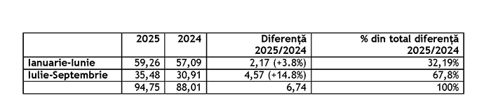 În ceea ce privește încasările din TVA, în perioada iulie-septembrie, acestea au fost de aproximativ 35,48 mld lei, dintr-un total de 94,75 mld lei aferent primelor 9 luni ale anului 2025. Comparativ cu aceeași perioada a anului trecut încasările au fost mai mari cu 6,74 mld lei, din care 4,57 mld lei reprezintă încasările suplimentare aferente trimestrului III 2025 (iulie-septembrie).
