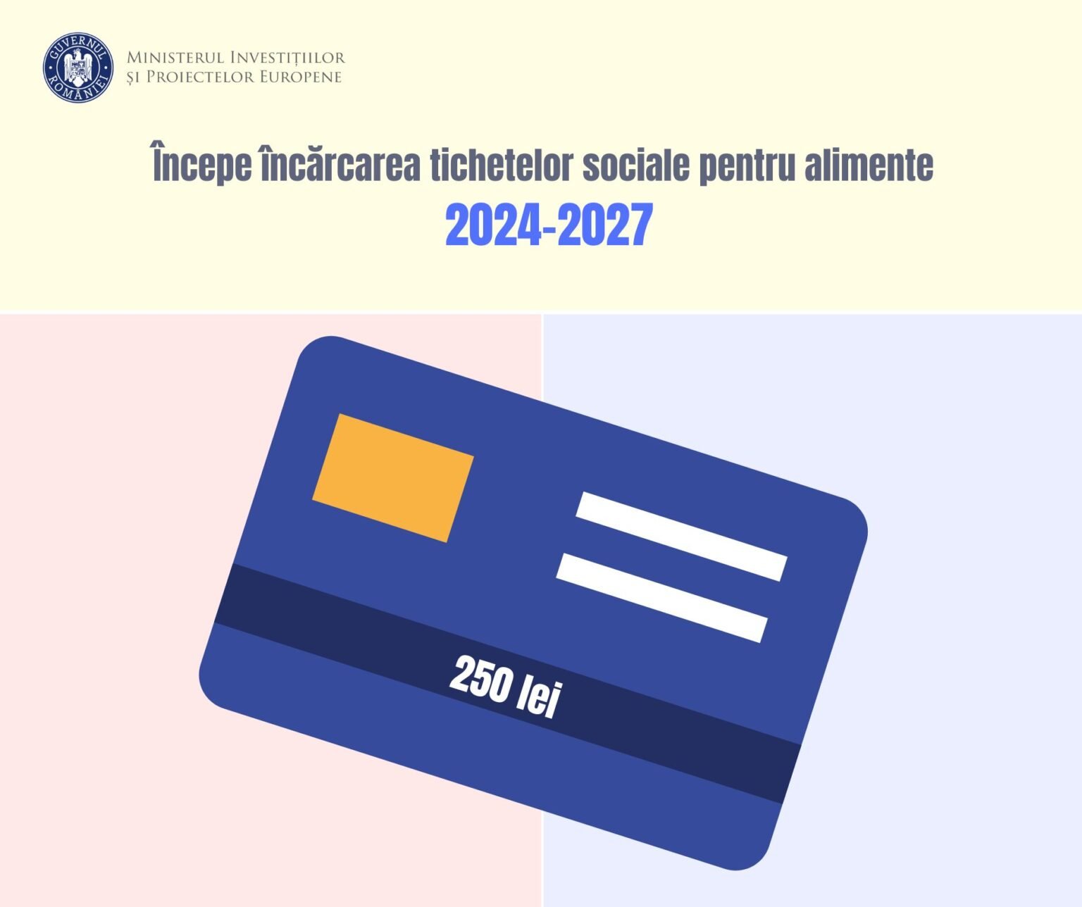 Ministerul Investițiilor și Proiectelor Europene a început alimentarea tichetelor sociale pentru alimente în valoare de 250 de lei pentru beneficiarii măsurii „Sprijin material pentru anumite categorii de persoane defavorizate în perioada 2024-2027”.