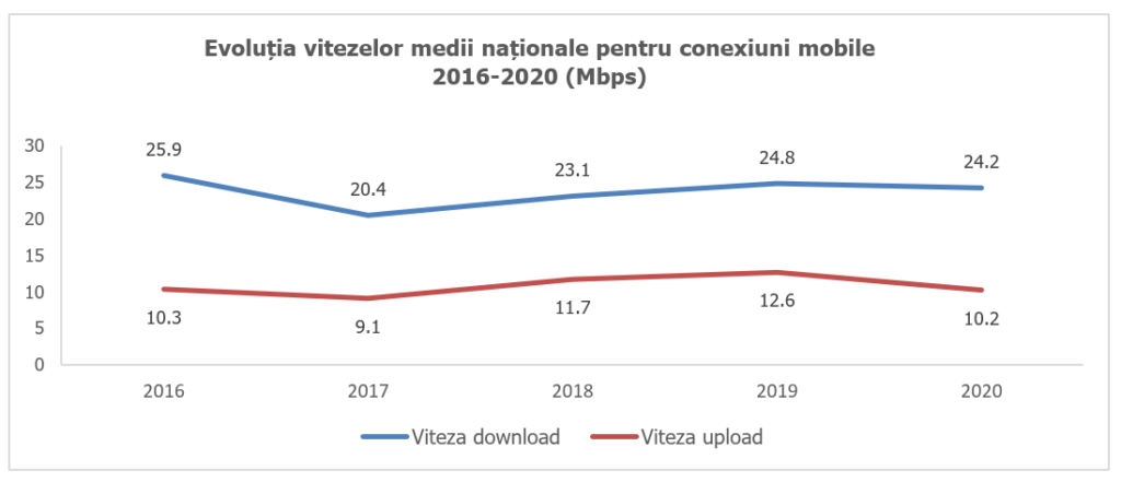 Rezultatele testelor efectuate de utilizatori pe platforma Netograf indică o viteză medie de download la nivel național pentru internetul mobil de 24,2 Mbps, păstrându-se constantă comparativ cu anul 2019, respectiv o viteză medie de upload de 10,2 Mbps pentru internetul mobil la nivel național pe parcursul anului 2020, în scădere cu 19%.