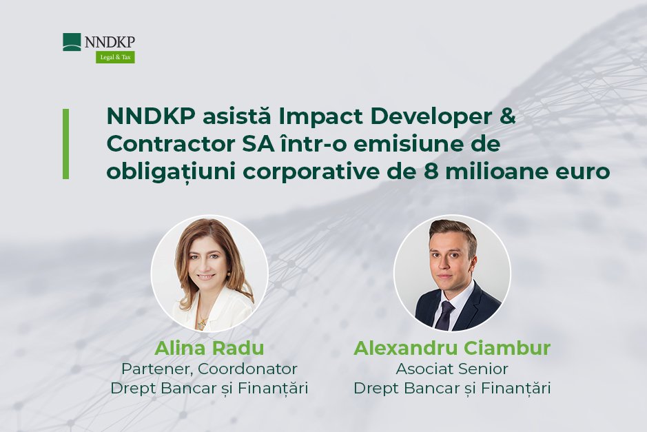 „Suntem extrem de bucuroși că am putut susține Impact Developer & Contractor în legătură cu obținerea acestei finanțări pentru dezvoltarea proiectelor pe care le are în plan și consolidarea poziției sale pe piața imobiliară din România. Le mulțumim pentru încrederea acordată și le urăm mult succes pe mai departe”, a declarat Alina Radu, Partener NNDKP.