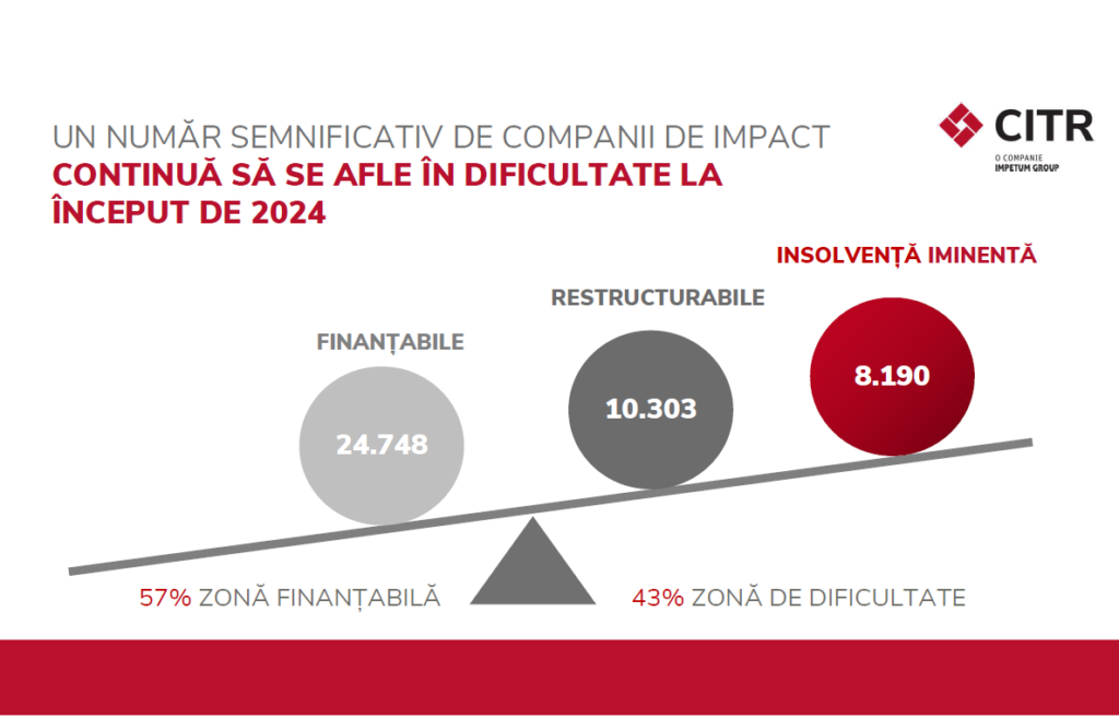 CITR, liderul pieței de insolvență și restructurare din România, anunță că numărul companiilor de impact aflate în insolvență iminentă crește cu 18%, de la 6.949 la 8.190, iar cel al companiilor de impact aflate în dificultate atinge cel mai înalt nivel din 2013 până în prezent. Studiul a fost realizat pe baza celor mai actuale date financiare oficiale, raportat la situația financiară a companiilor la începutul anului 2024.