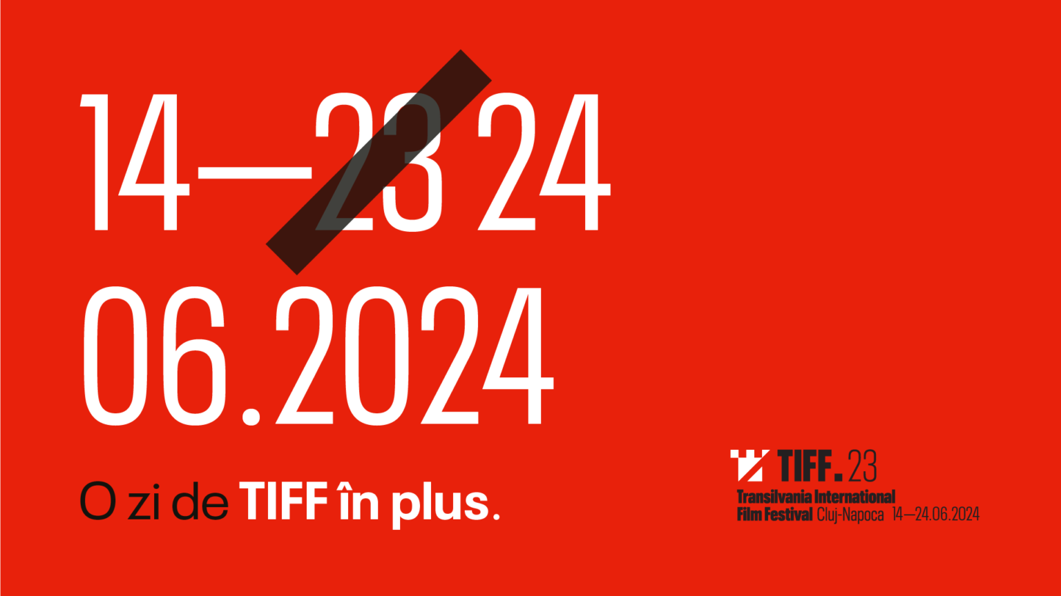 Festivalul Internațional de Film Transilvania (TIFF) anunță prelungirea perioadei de desfășurare a ediției din 2024 cu o zi față de datele comunicate inițial. TIFF va avea loc între 14 – 24 iunie, incluzând astfel și a doua zi de Rusalii (24 iunie), declarată sărbătoare legală. Această nouă zi de TIFF va fi dedicată retrospectivei celor mai populare filme din festival, filmelor premiate, dar și unor evenimente surpriză.