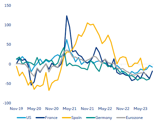 Pe măsură ce dobânzile tot mai ridicate cresc costurile ratelor ipotecare, prețul locuințelor și autorizațiile de construcție înregistrează o scădere în majoritatea țărilor dezvoltate din punct de vedere economic. Încă din ultimul trimestru al anului 2022, piața globală a construcțiilor a încetinit semnificativ, înregistrând o scădere a prețurilor (-10% în Germania în T2 2023, comparativ cu -2% pentru zona euro în ansamblu). În SUA, Marea Britanie, Franța și Italia, prețurile locuințelor continuă să crească, într-un ritm mai lent. În acest context, autorizațiile vor înregistra, de asemenea, o scădere semnificativă (Figura 1), în special în Germania (-38% în august 2023).