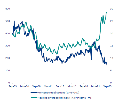 Ratele dobânzilor ridicate se observă și în Statele Unite și se situează în prezent la aproape 8% pentru ipotecile pe 30 de ani, ceea ce determină pe de o parte creșterea semnificativă a plăților lunare și pe de altă parte diminuează puterea de cumpărare a potențialilor cumpărători. Acest lucru a descurajat investitorii să acceseze piața imobiliară, rezultând astfel un declin al cererii de ipoteci (Figura 2).