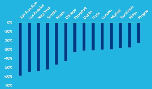 Segmentul spațiilor de birouri navighează în ape tulburi, înregistrând o scădere semnificativă determinată de creșterea ratelor dobânzilor și de adoptarea muncii hibride. În Europa, prețurile spațiilor de birouri au fost afectate din cauza randamentelor inițial mici, în timp ce SUA au înregistrat o creștere datorită unui stoc mai mare de clădiri noi vacante (Figura 4). Piața este acum divizată între clădirile certificate din punct de vedere energetic cu un cost ridicat și cele care necesită modernizări costisitoare, băncile fiind tot mai reticente în acordarea finanțării.