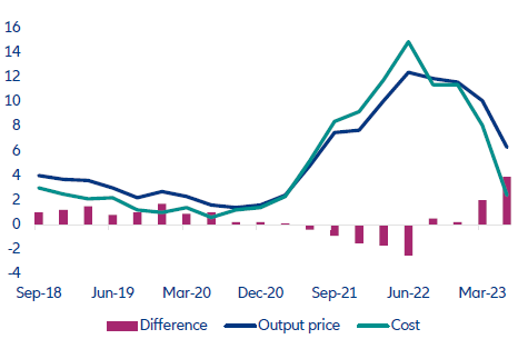 În prezent, industria construcțiilor se bucură de o încetinire a creșterii prețurilor la materialele de construcție, în special la ciment și produse din beton, esențiale pentru proiectele de construcții și de infrastructură. Încetinirea este rezultatul consolidării prețurilor la energie, al fluidizării lanțurilor de aprovizionare și al stabilizării cererii. Cu toate acestea, presiunile salariale persistente continuă. Sectorul construcțiilor se confruntă în prezent și cu o creștere semnificativă a costurilor cu forța de muncă, care exercită presiuni asupra rentabilității. În Franța și Italia, salariile reglementate care se aplică lucrătorilor din construcții sunt în creștere cu +4% față de anul anterior, începând cu septembrie/august 2023, în timp ce în SUA salariile sunt în creștere cu +6%.