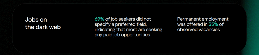 Joburile de pe dark web sunt predominant asociate cu activități ilegale, deși există și unele roluri legitime. Conform datelor Kaspersky, 69% dintre candidați nu au specificat un domeniu preferat, semnalând deschis că sunt dispuși să accepte orice oportunitate plătită – de la programare la escrocherii sau operațiuni cibernetice avansate. Cele mai căutate roluri IT de către angajatorii de pe dark web reflectă un ecosistem criminal matur: