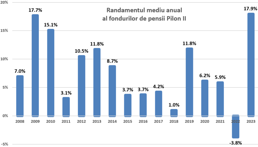 Cele 7 fonduri de pensii private obligatorii (Pilonul II) au înregistrat în 2023 un randament mediu ponderat de 17,94%, cea mai bună performanță anuală din întreg istoricul sistemului și cu peste 10 puncte procentuale peste rata inflației estimate pentru anul trecut, potrivit calculelor APAPR. În același timp, activele nete administrate de Pilonul II au ajuns la 126,7 miliarde RON (25,5 mld. EUR), o valoare record pentru sistem, în creștere cu 31,4% față de sfârșitul anului 2022.
