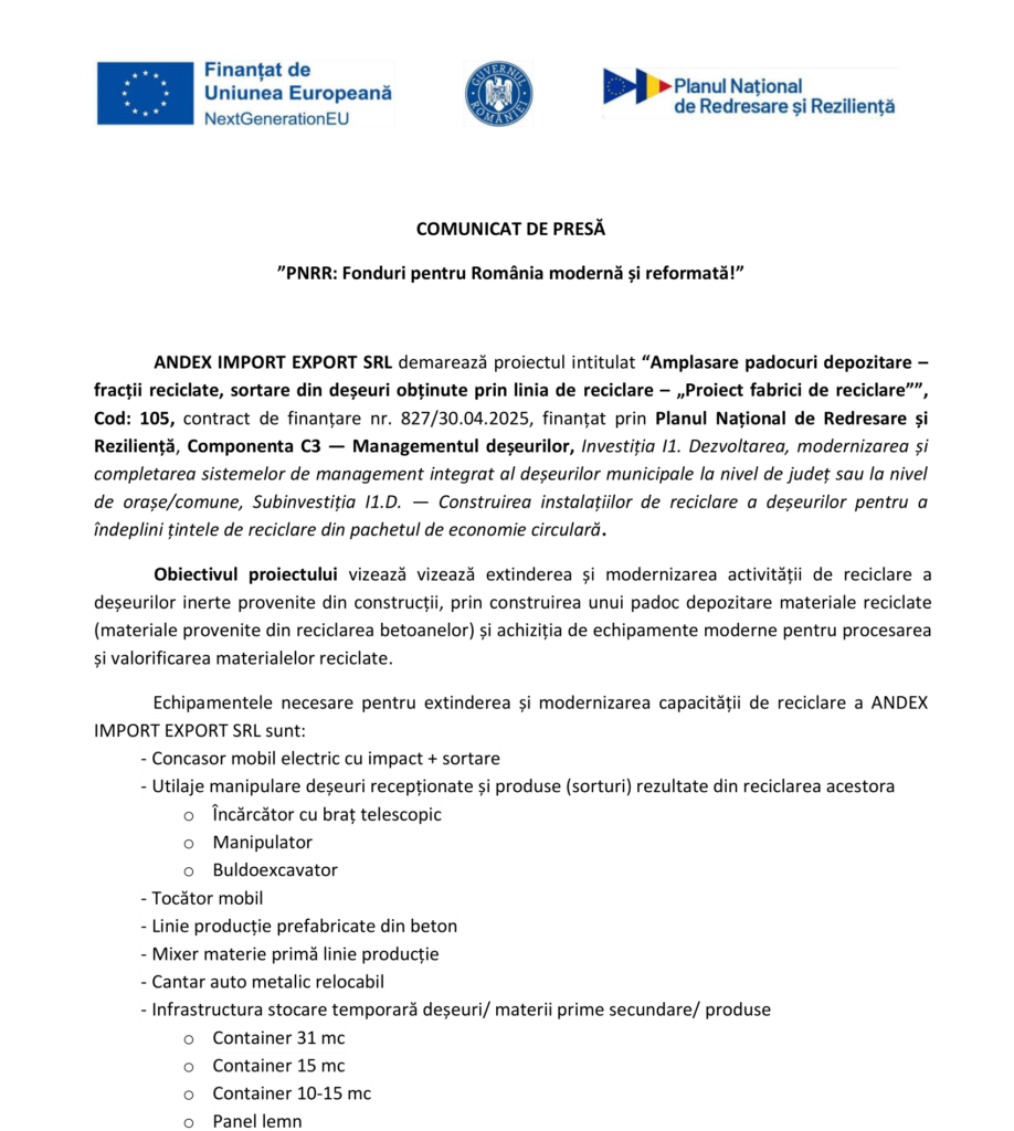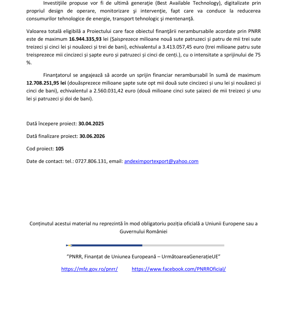 Fonduri Europene „PNRR: Fonduri pentru România modernă și reformată!” Autor Contributor Publicat 17 iunie 2025 Distribuie Distribuie articolul Facebook Whatsapp Whatsapp LinkedIn Reddit Telegram Email Copy Link Print Distribuie Articolul anterior Ghid pentru alegerea feroneriei potrivite în renovarea locuinței Articolul următor „PNRR: Fonduri pentru România modernă și reformată!” Niciun comentariu Lasă un răspuns Anulează răspunsulAdresa ta de email nu va fi publicată. Câmpurile obligatorii sunt marcate cu *Comentariu * Nume * Email * Site web -Publicitate- Ultimele articole Industria de înfrumusețare, supusă controalelor ANPC Actualitate Depozitarul Central va distribui sumele de bani aferente CUPON 19 pentru obligațiunile emise de SELFPAY S.A. Economie Verificări extinse în unitățile din industria agroalimentară pentru menținerea standardelor de siguranță Actualitate Știri FinanciareLivrările de birouri flexibile din București au crescut de peste trei ori față de anul trecut Bucătăria este „inima casei” pentru români. Gătitul rămâne o parte esențială în fiecare gospodăriePrimul Lidl sub noua identitate vizuală, inaugurat la Întorsura BuzăuluiProprietarii Dedeman vor prelua operațiunile Carrefour în România pentru 823 milioane de euro