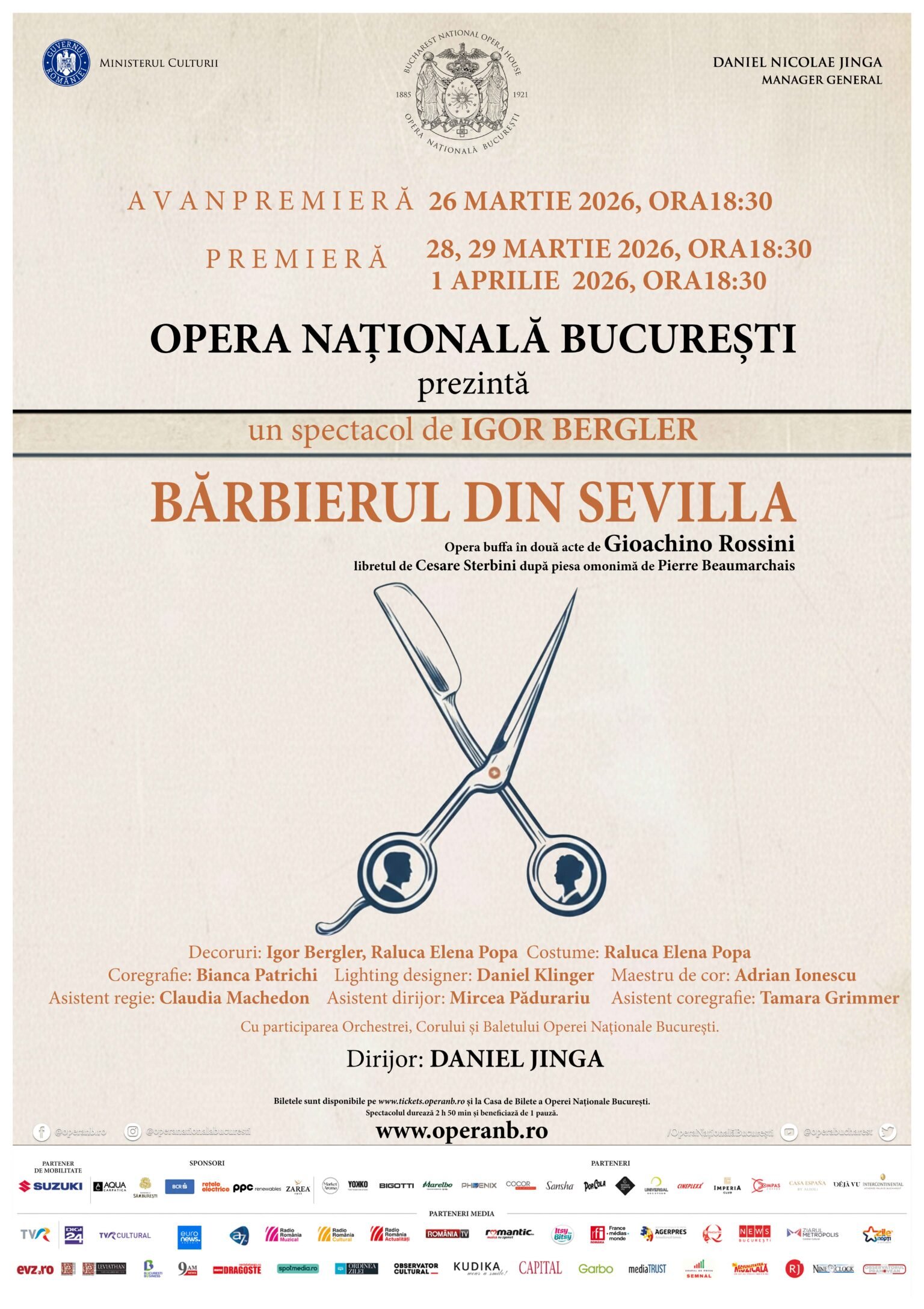 Opera Națională București prezintă premiera spectacolului „Bărbierul din Sevilla” de Gioachino Rossini, într-o montare în regia lui Igor Bergler, decorurile poartă semnăturile lui Igor Bergler și a Ralucăi Popa, costumele au fost create de Raluca Popa, coregrafia îi aparține Biancăi Patrichi, luminile Daniel Klinger, iar conducerea muzicală va fi asigurată de maestrul Daniel Jinga. Reprezentațiile se vor desfășura în serile de joi, 26 martie (avanpremieră), sâmbătă, 28 martie duminică, 29 martie, și miercuri, 1 aprilie, cu titlu de premieră, începând cu ora 18:30, cu participarea Orchestrei, Corului și Baletului Operei Naționale București, maestru de cor Adrian Ionescu, asistent regie Claudia Machedon, asistent dirijor Mircea Pădurariu.