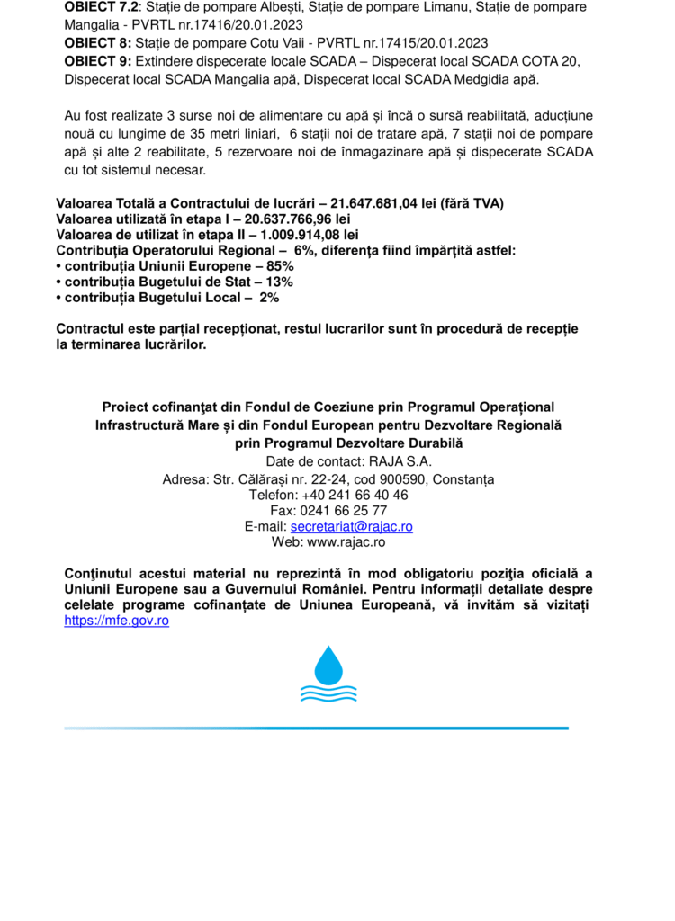 RAJA a finalizat Contractul de lucrări CL44 “Rezervor Albești, Faclia, Castelu, Tortoman. Stație de pompare Albești, Castelu, Tortoman; Foraje noi Poiana, Tortoman. Stație de clorare Castelu, Tortoman, Albești, Faclia. Gospodărie de apă pentru localitățile Dulcești, Moșneni și Pecineaga. Reabilitare stație pompare Cotu Văii. Stație de pompare Albești. Stație de pompare și stație clorare Limanu. Stație de pompare Mangalia”