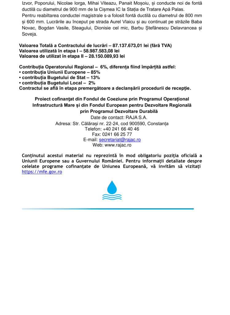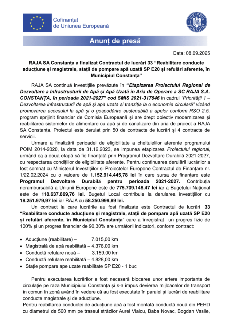 RAJA SA Constanța a finalizat Contractul de lucrări 33 “Reabilitare conducte aducțiune și magistrale, stații de pompare apă uzată SP E20 și refulări aferente, în Municipiul Constanța”