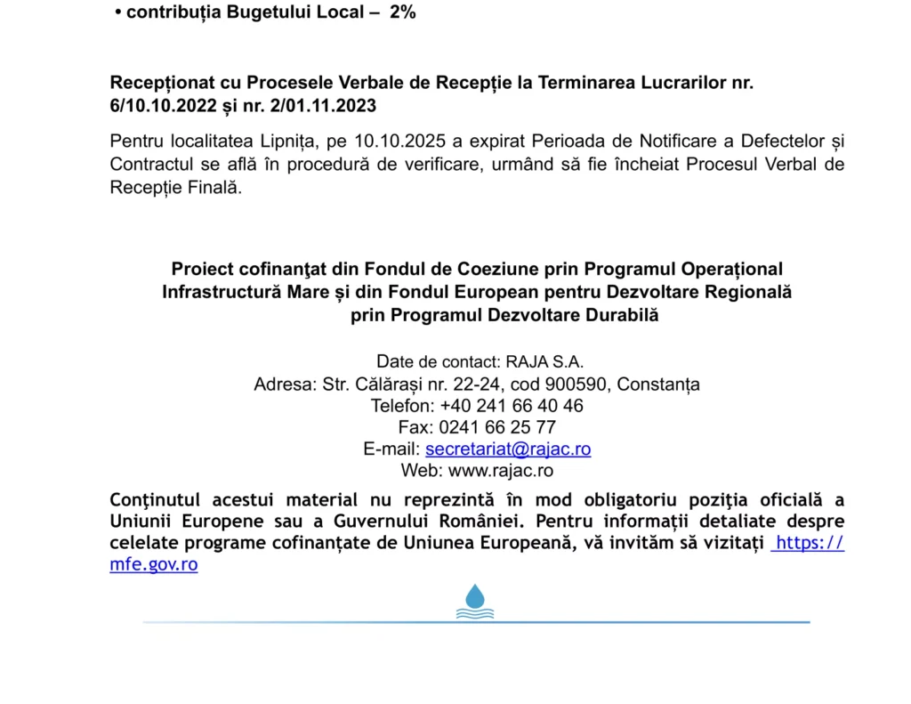 Reading:RAJA SA Constanța a finalizat Contractul de lucrări CL14 „Rețele de apă și aducțiune Lipnița. Stație de ridicare a presiunii Băneasa. Rețele de canalizare Băneasa”