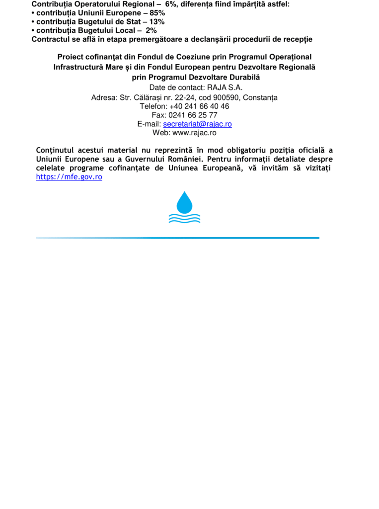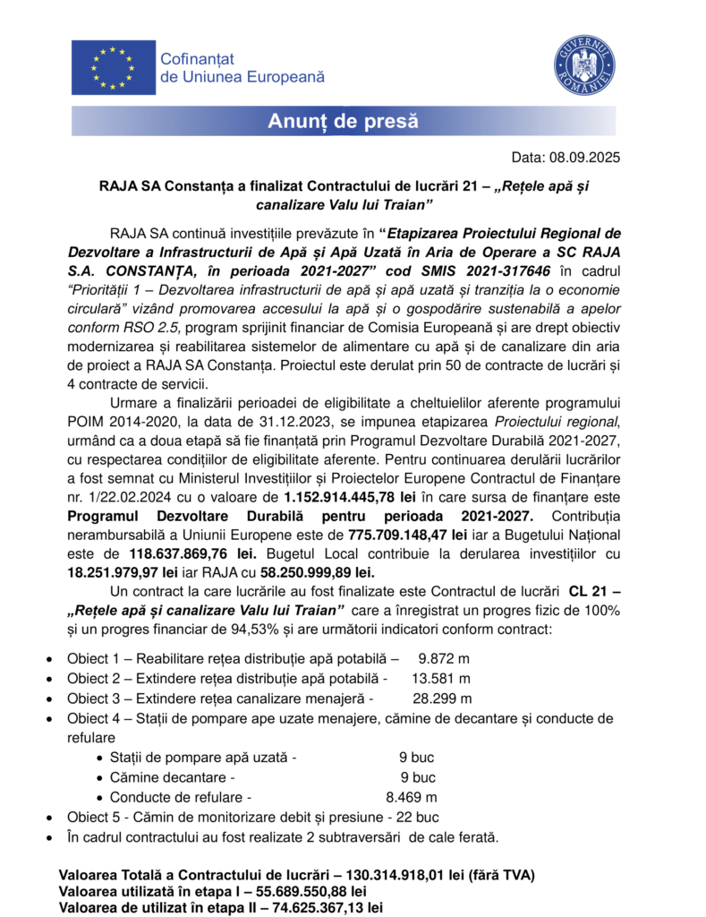 Fonduri Europene RAJA SA Constanța a finalizat Contractului de lucrări 21 – „Rețele apă și canalizare Valu lui Traian” Autor Contributor Publicat 8 septembrie 2025 Distribuie Distribuie articolul Facebook Whatsapp Whatsapp LinkedIn Reddit Telegram Email Copy Link Print Distribuie Articolul anterior RAJA SA Constanța a semnat procesul verbal de recepție finală al contractului de lucrări CL 18 „Rețele de apă Limanu, 2 Mai, Vama Veche, Albești, Cotu Văii. Rețele de canalizare Limanu” – Obiectiv recepționat: Rețea de apă în localitatea Albești, stație de pompare apă și rețea de apă în localitatea Cotu Văii Articolul următor Contractul de lucrări CL 26 – „Rețele de apă Țăndărei, Căzănești, Fierbinți Târg și Dridu. Rețele de canalizare Țăndărei, Căzănești și Fierbinți Târg.” implementat de RAJA SA Constanța este în curs de finalizare Niciun comentariu Lasă un răspuns Anulează răspunsulAdresa ta de email nu va fi publicată. Câmpurile obligatorii sunt marcate cu *Comentariu * Nume * Email * Site web -Publicitate- Ultimele articole Ursula von der Leyen: „Europa nu are altă opțiune decât să devină independentă” Extern Industria de înfrumusețare, supusă controalelor ANPC Actualitate Depozitarul Central va distribui sumele de bani aferente CUPON 19 pentru obligațiunile emise de SELFPAY S.A. Economie Știri FinanciareLivrările de birouri flexibile din București au crescut de peste trei ori față de anul trecut Bucătăria este „inima casei” pentru români. Gătitul rămâne o parte esențială în fiecare gospodăriePrimul Lidl sub noua identitate vizuală, inaugurat la Întorsura BuzăuluiProprietarii Dedeman vor prelua operațiunile Carrefour în România pentru 823 milioane de euro