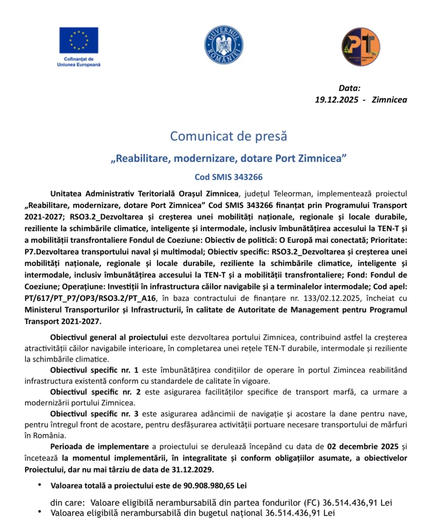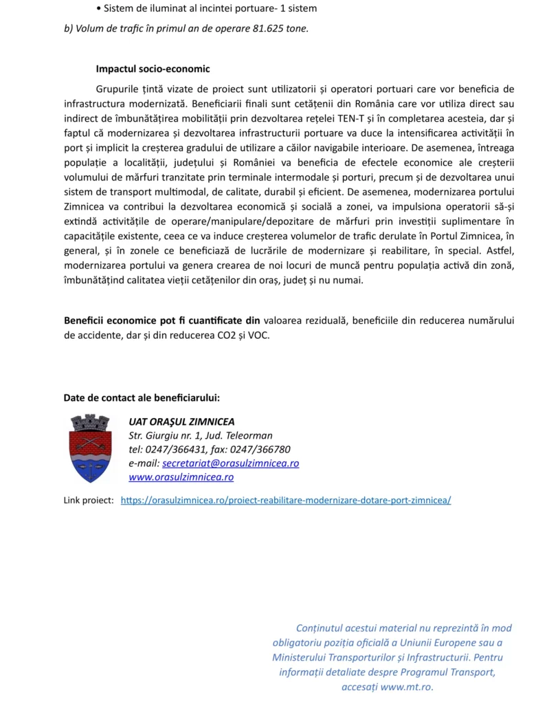 „Reabilitare, modernizare, dotare Port Zimnicea” Cod SMIS 343266