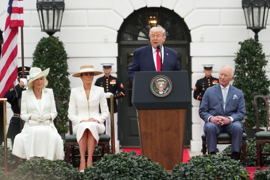 Regele Charles al III-lea al Marii Britanii, Regina Camilla și prima doamnă Melania Trump ascultă discursul președintelui Donald Trump în timpul unei ceremonii de sosire în cadrul vizitei de stat pe peluza sudică a Casei Albe, marți (Alex Brandon/AP)