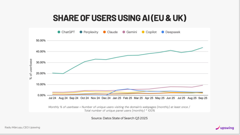Figura 2: Peisajul AI în Europa și UK: ChatGPT își consolidează poziția de lider dominant, dublându-și cota de utilizare într-un singur an, în timp ce competitorii precum Gemini sau Copilot cresc într-un ritm mai lent. Date analizate de Upswing pe baza raportului Datos State of Search Q3 2025.