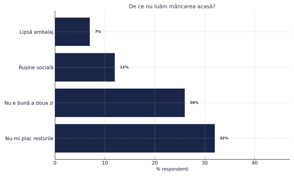 - Motivele principale pentru care mâncarea nu este luată acasă sunt: dezgustul față de resturi (31,5%) și percepția că nu mai este bună a doua zi (25,8%).