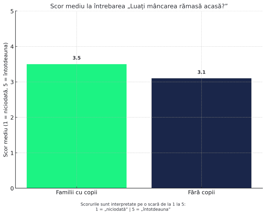Familiile cu copii demonstrează un comportament semnificativ mai responsabil în fața risipei. În sondaj, părinții au obținut un scor mediu de 3,5 din 5 la întrebarea privind luarea mâncării acasă, față de 3,1 în rândul celor fără copii. Acest comportament ar putea fi alimentat nu doar de grijă economică, ci și de dorința de a educa și transmite valori legate de respectul față de hrană și muncă.