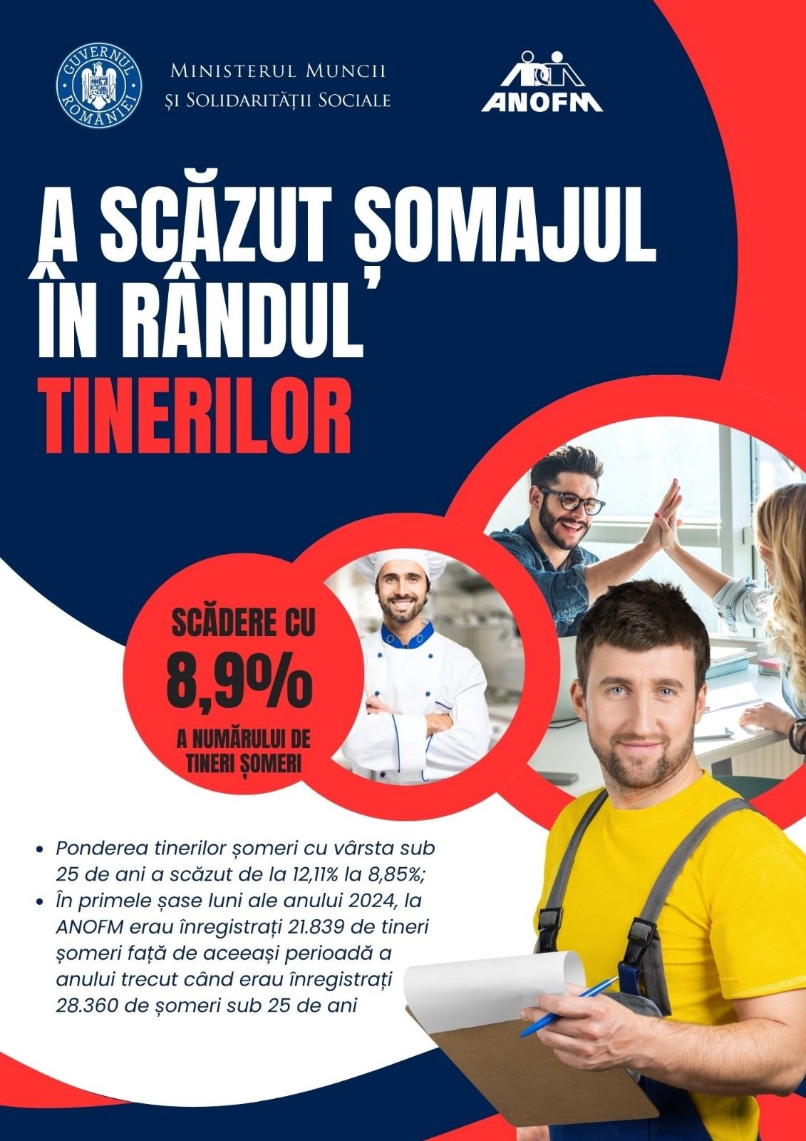 Ultimele date statistice arată o scădere semnificativă a șomajului în rândul tinerilor în România pe parcursul primei jumătăți a anului 2024. Conform Agenției Naționale pentru Ocuparea Forței de Muncă, instituție sub autoritatea Ministerului Muncii și Solidarității Sociale, media lunară a numărului de șomeri tineri înregistrați, cu vârsta sub 25 de ani, a scăzut în primele șase luni ale anului în curs la 21.839, față de o medie de 28.365 în perioada similară a anului trecut. Este vorba despre o scădere a ponderii tinerilor șomeri în totalul șomerilor la 8,85%, comparativ cu 12,11% în primele șase luni ale anului 2023.