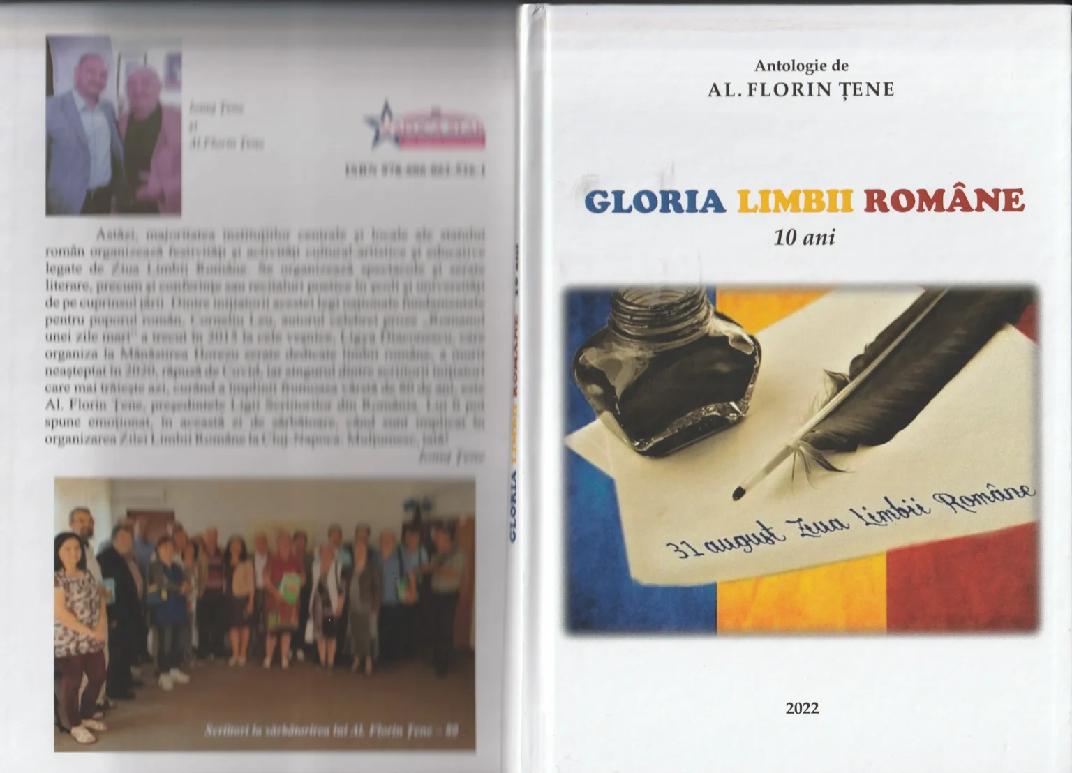 La împlinirea a 10 ani de la aprobare de către parlamentul româniei, am publicat cartea ”Gloria Limbii Române”, la editura Napoca star din Cluj Napoca, cu o Prefață de dr.Ionuț Țene, în care relatează pe larg istoria Limbii Româe, importanța acesteia, concluzionând: ”Dintre inițiatorii acestei legi naționale și fundamentale pentru poporul roman, Corneliu leu, autorul celebrei proze”Romanul unei zile mari ” a trecut la cele veșnice în 2015, Ligya Diaconescu, care a organizat la Mănăstirea Horezu serate dedicate Limbii Române, a murit neașteptat în 2020, răpusă de Covid, iar singurul dintre scriitorii inițiatori care mai trăiește azi, în curând a împlinit frumoasăa vârstă de 80 de ani, este Al.Florin Țene, președintele Ligii Scriitorilor din România. Lui îi pot spune emoționat, în această zi de sărbătoare, când sunt implicat în organizarea Zilei Limbii Române la Cluj-Napoca: Mulțumesc, tata. (Apărut în Napoca News din 31 august 2022 și în Luceafărul net din 1 septembrie 2022).