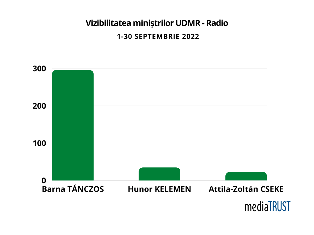 UDMR se remarcă prin ministrul Barna TÁNCZOS, cu 459 materialepe TV, în creștere față de luna august când a fost citat în 325 de materiale. Vârful vizibilității s-a înregistrat în data de 7 septembrie, în contextul haosului generat în aeroporturile din România, după ce compania Blue Air a anunțat că anulează toate zborurile. Compania a transmis atunci că a ajuns în această situație pentru că i-au fost blocate conturile de către Ministerul Mediului și nu mai poate să își folosească banii. Conform studiului, cele mai active surse TV în perioada 1-30 septembrie 2022, au fost ANTENA3 (66 mențiuni), Digi24 (59), PROTV (50), Romania TV (49) și Euronews Romania (47). Astfel, conform mediaTRUST, fiecare român a putut urmări mesajele ministrului în medie de 4 ori în cursul lunii septembrie (70,757,000 contacte).