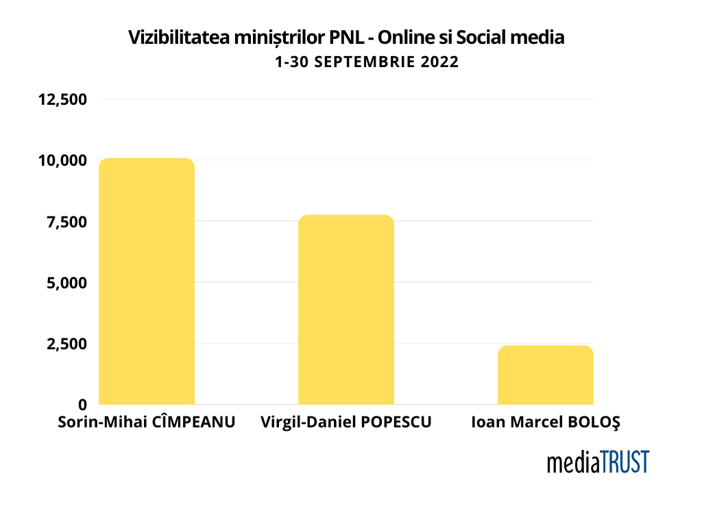 Cel mai citat ministru din partea PNL este Sorin-Mihai CÎMPEANU, cu 10.075 de materiale în online și social media în perioada monitorizată de mediaTRUST, 1-30 septembrie 2022. Acesta înregistrează o creștere față de luna trecută, când a avut 7.736 de referințe în online și social media. Audiența însumată a informațiilor despre ministrul demisionar al educației (30,125,203) se traduce prin faptul ca fiecare român a avut acces la mesajele acestuia de aproape 2 ori în cursul lunii septembrie.