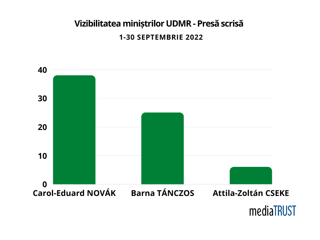 UDMR se remarcă prin ministerul sportului, reprezentat prin Carol-Eduard NOVÁK, cu 38 de mențiuni în presa scrisă din România în perioada monitorizată de mediaTRUST, 1-30 septembrie 2022, în scădere față de august când a fost menționat de 80 de ori. Vârful de vizibilitate este în data de 1 septembrie 2022, în contextul intenției de a majora sancţiunile pentru cluburile care folosesc peste 60% sportivi străini. Sursele cele mai active în menționarea ministrului sportului în cadrul publicațiilor scrise, sunt: Obiectiv de Suceava, Gazeta Sporturilor, Jurnal Arădean și Caţavencii.