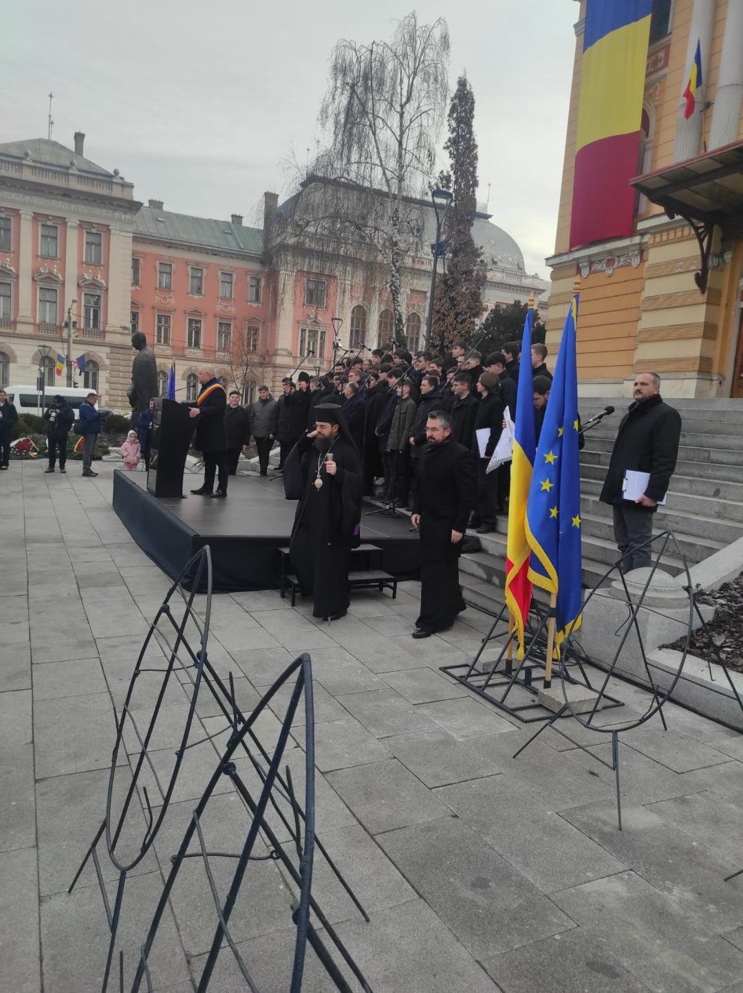 Miercuri, 15 ianuarie Primăria Cluj-Napoca, în colaborare cu Uniunea Scriitorilor, filiala Cluj, la ora 11, s-a desfășurat manifestarea, tradițională, de depuneri de coroane la statuile lui Mihai Eminescu și Lucian Blaga din fața Teatrului Național.Manifestare, coordonată de dr.Ionuț Țene,. Manifestarea s-a deschis cu un concert de cântece pe versuri de Mihai Eminescu, susținut de corul Liceului Teologic. După care a vorbit primarul municipiului Emil Boc. care a transmis următorul mesaj: „Mihai Eminescu reprezintă esența și ființa neamului românesc. Susținând unitatea culturală, susținem unitatea politică a românilor, aspect mai actual ca oricând acum în România și în Europa. Orașul nostru respiră prin cultură, prin educație pentru că face parte din ADN-ul Clujului și va rămâne o citadelă culturală. Apelul meu este pentru toată lumea, să susțină actul de cultură, pentru că dacă susținem cultura susținem democrația, pacea, prosperitatea și o viață mai bună între noi.”. De asemenea, scriitoarea Constantina Raveca Buleu a transmis un mesaj dedicat culturii, iar elevii Liceului Teoretic „Lucian Blaga” au susținut un micro-recital artistic din opera poetului Mihai Eminescu. După care a urmat ceremonialul de depunere de coroane din partea oficialităților, instituțiilor, partidelor politice, Liga Scriitorilor și Uniunea Scriitorilor.Al.Florin Țene și Iulian Patca, membri UZPR, au depus o coroană de flori la statuia Poetului și din partea UZPR.Manifestarea desfășurându-se pe muzica compusă pe versurile poetului Mihai Eminescu.